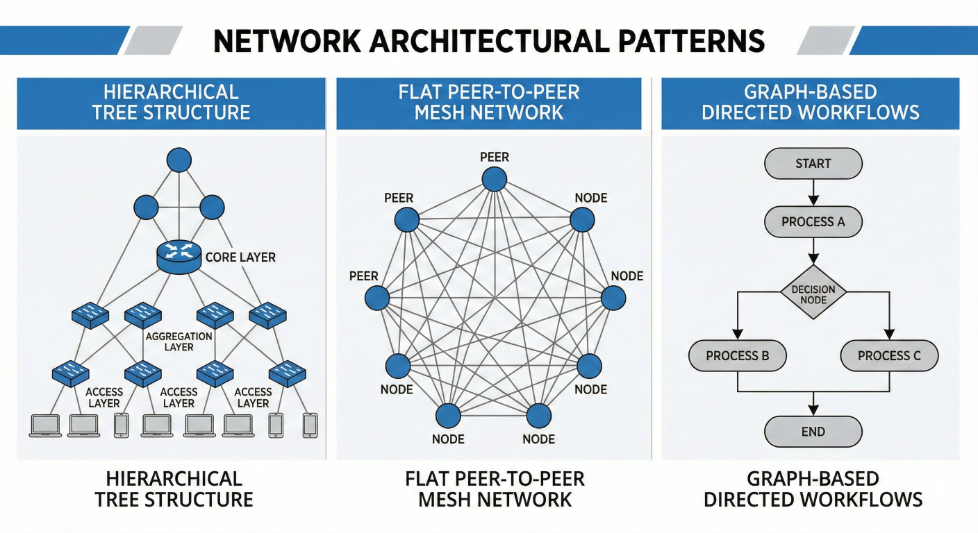 Network topology diagram showing different architectural patterns side by side: hierarchical tree structure, flat peer-to-peer mesh network, and graph-based directed workflows