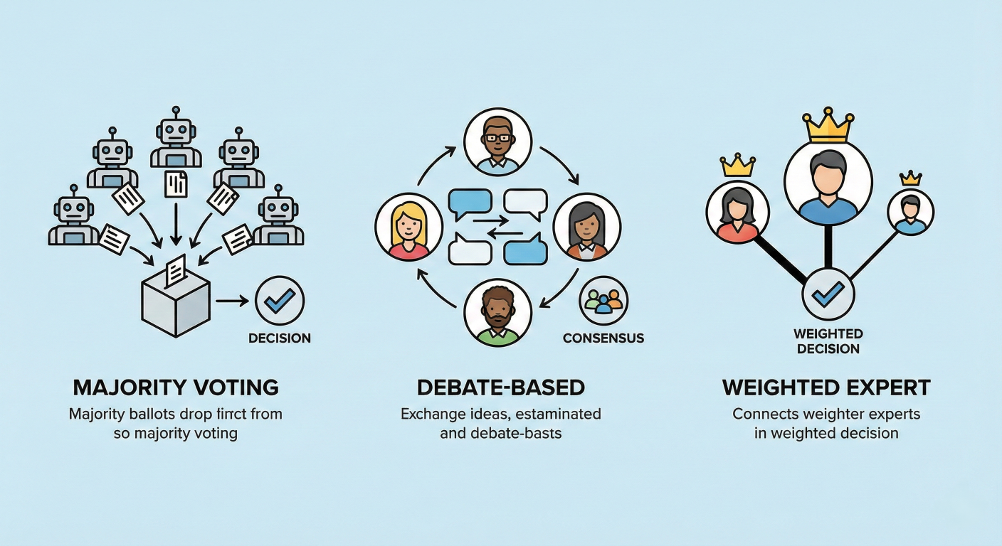 The consensus mechanisms we examined—majority voting, debate-based resolution, and weighted expert systems—show how multi-agent systems can achieve reliable decision-making even when individual agents disagree. This collaborative validation significantly reduces the hallucination problems that plague single-agent systems.