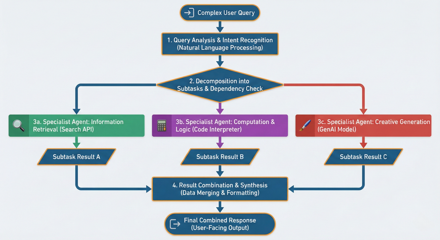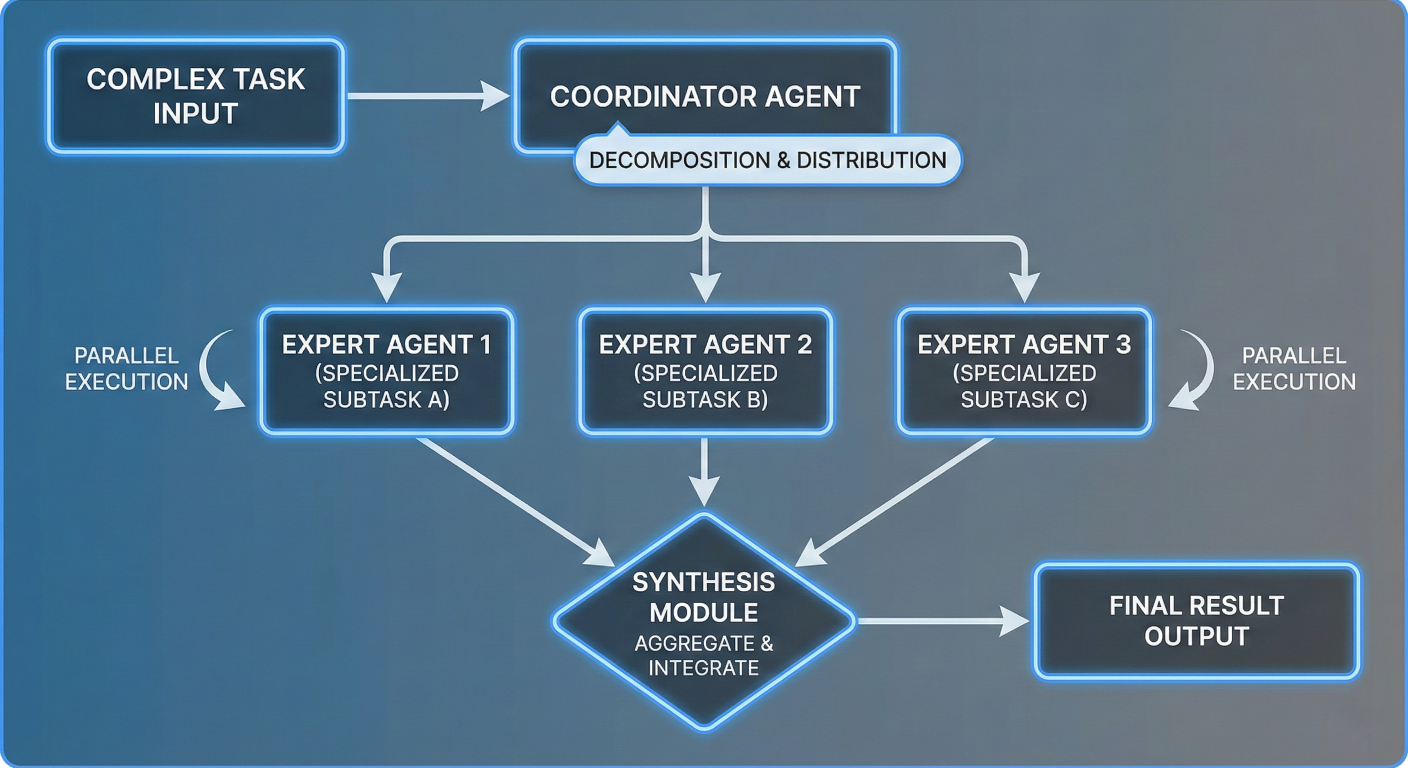 Process flow diagram illustrating how complex tasks get decomposed by a coordinator agent into specialized subtasks, distributed to expert agents, executed in parallel, and synthesized into final results