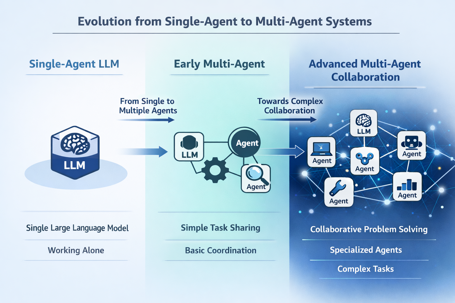 High-level conceptual diagram showing the evolution from single-agent to multi-agent systems, with visual progression from one isolated LLM to multiple interconnected agents collaborating on complex tasks