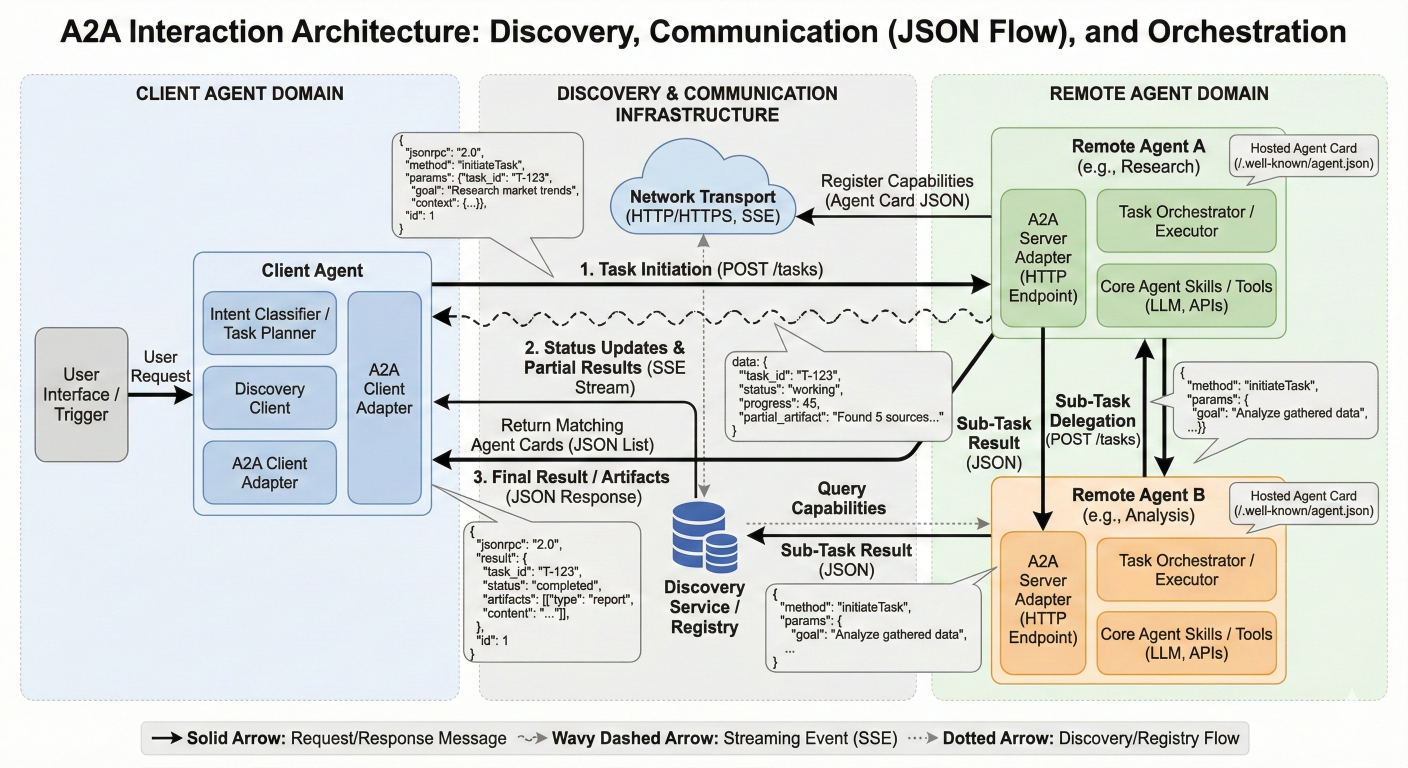 Detailed system architecture diagram showing A2A interaction components: Agent discovery mechanisms, communication protocols (showing JSON message flow), and task orchestration workflows with arrows indicating information flow between agents