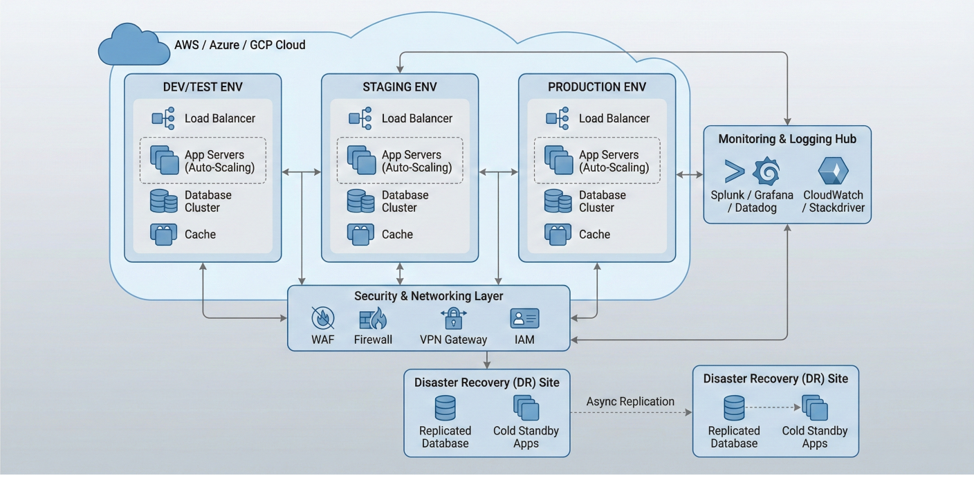 Detailed description about picture/Architecture/Diagram: Production infrastructure diagram showing multi-environment setup, security layers, monitoring integration, and scaling mechanisms. Include cloud provider integrations and disaster recovery components.