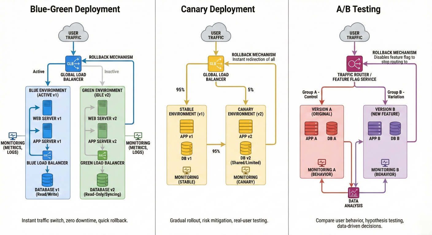 Airflow orchestrates sophisticated deployment patterns that minimize risk while maximizing observability.