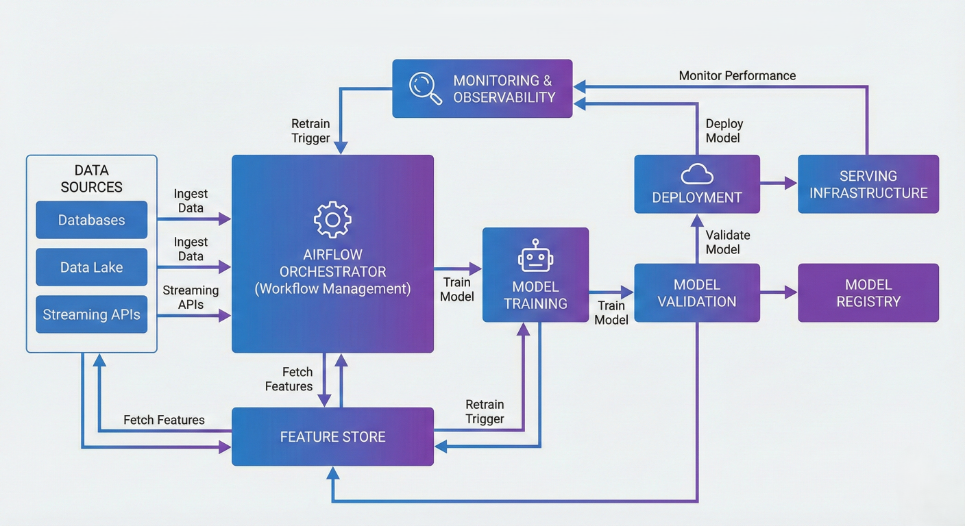 Detailed description about picture/Architecture/Diagram: High-level MLOps architecture showing Airflow as the central orchestrator connecting data sources, feature stores, model training, validation, deployment, and monitoring components. Include arrows showing data flow and dependencies between components.