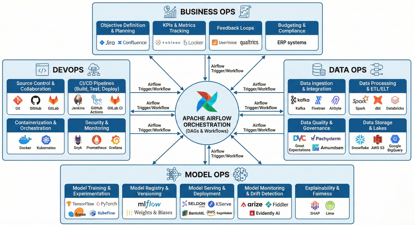 Detailed description about picture/Architecture/Diagram: Detailed MLOps components diagram showing the four pillars (BusinessOps, DevOps, DataOps, ModelOps) with Airflow orchestrating workflows across all components. Include specific tools and integrations for each pillar.