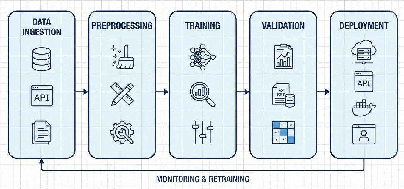 Flow diagram showing ML pipeline components: data ingestion → preprocessing → training → validation → deployment