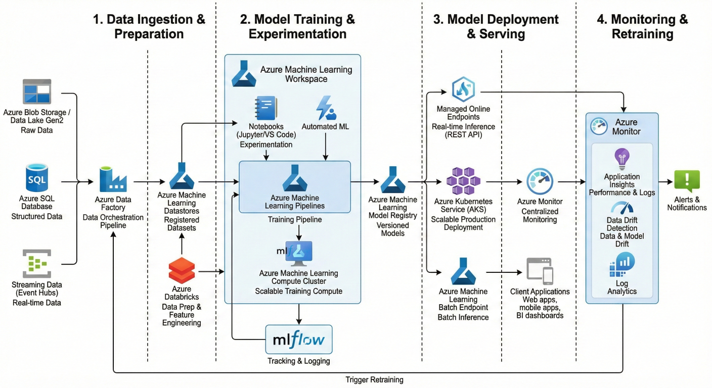 Architecture diagram showing complete MLOps workflow in Azure ML with data ingestion, model training, deployment, and monitoring components