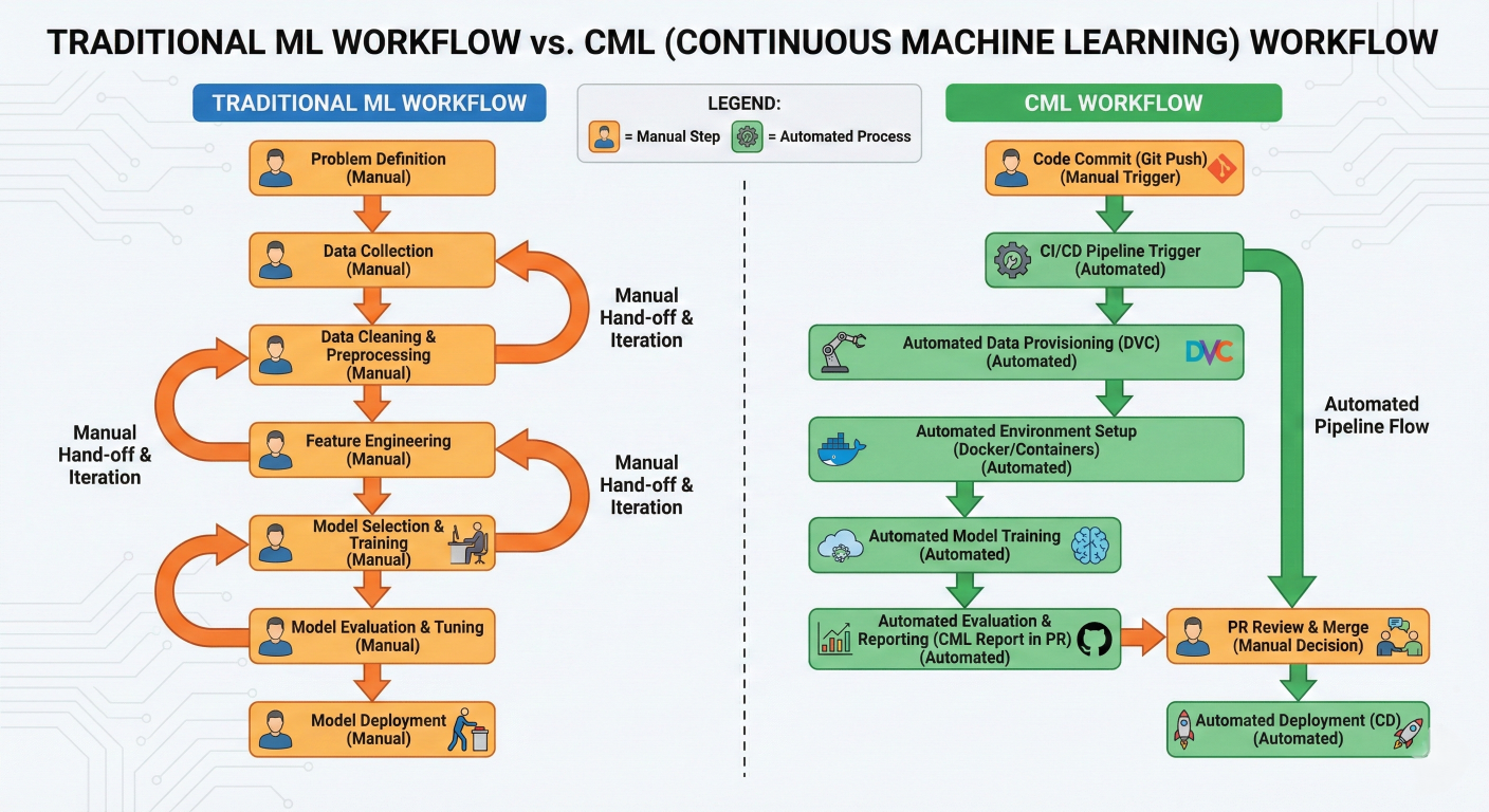 Unlike traditional machine learning approaches where models are trained once and deployed statically, CML creates living, breathing ML systems that continuously adapt to new data, automatically retrain when performance degrades, and maintain optimal accuracy through systematic monitoring and feedback loops