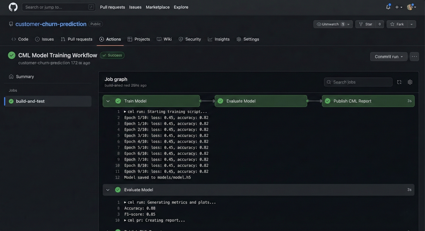 Screenshot of GitHub Actions workflow running CML pipeline with automated model training and evaluation steps