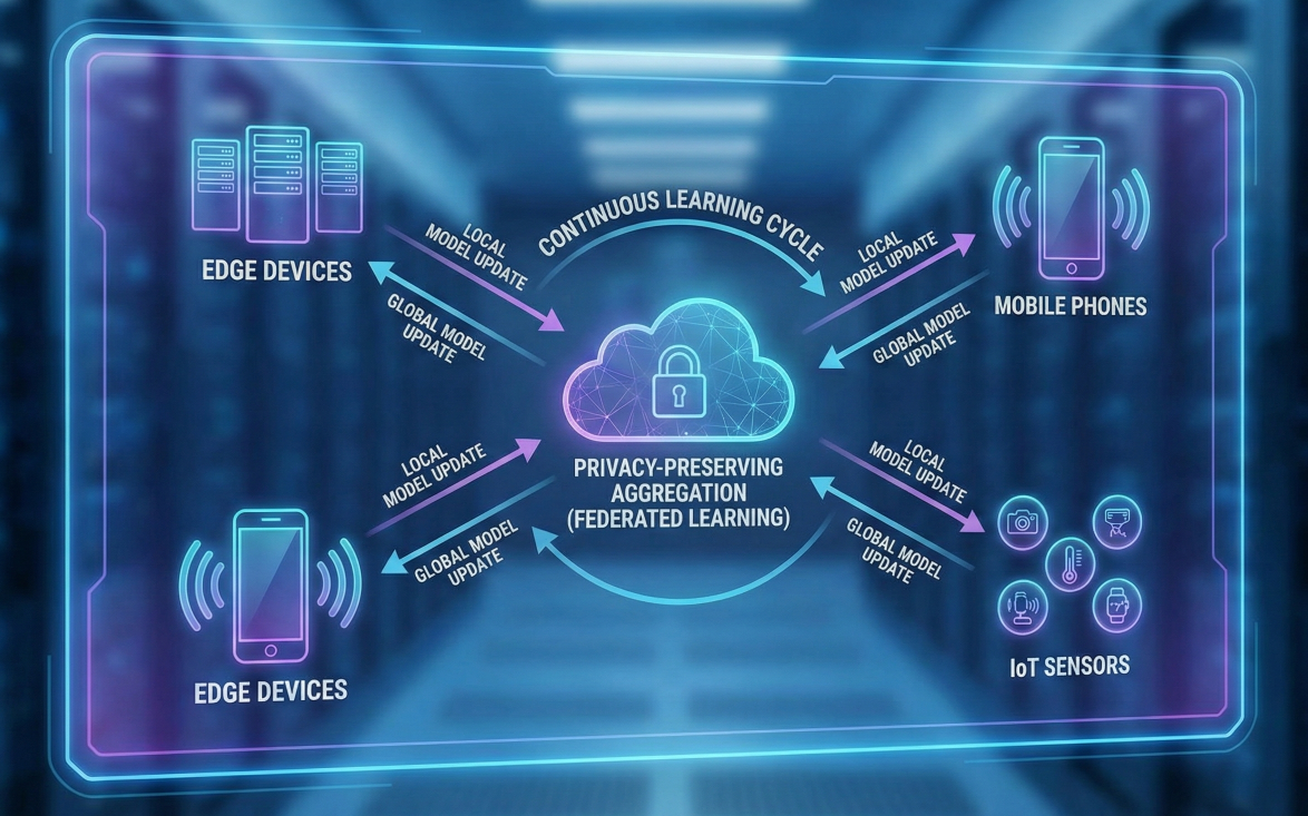 Futuristic diagram showing federated continuous learning across edge devices, mobile phones, and IoT sensors with privacy-preserving aggregation