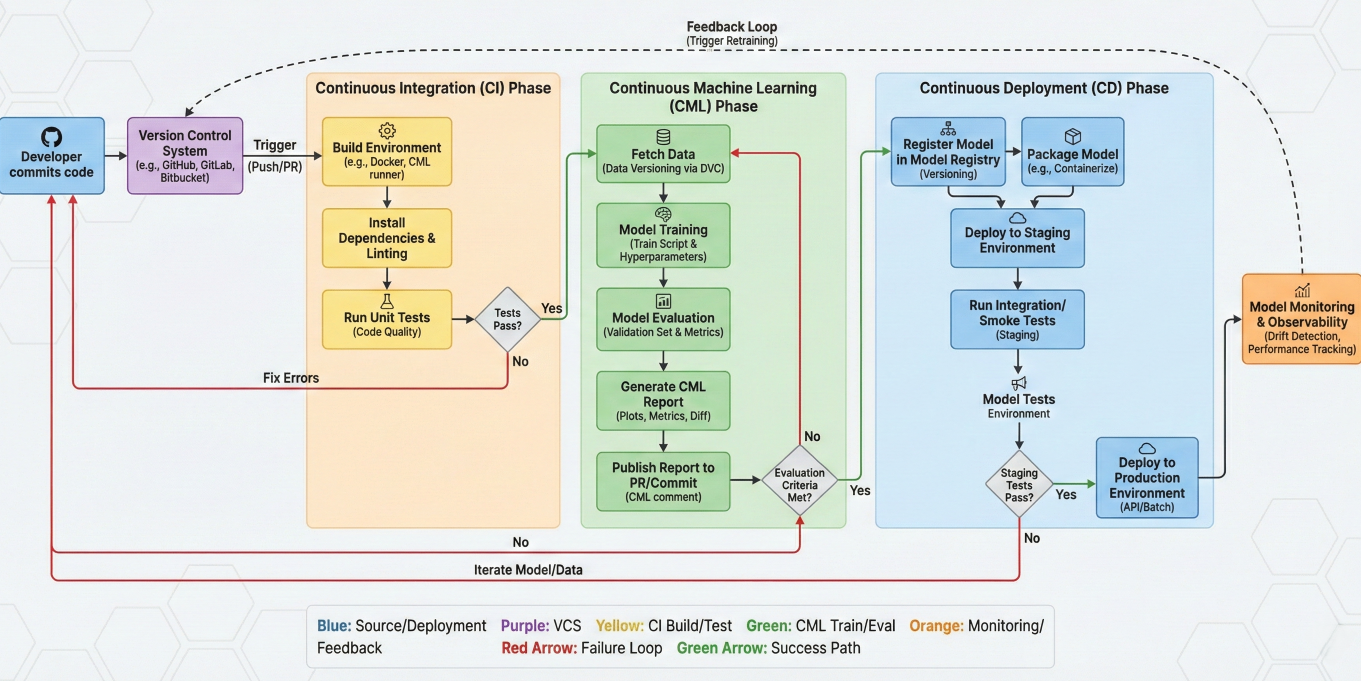 Continuous Machine Learning (CML) represents a paradigm shift in how we approach machine learning operations. It's an open-source library that brings the proven practices of continuous integration and continuous delivery (CI/CD) to machine learning projects, enabling automated model training, evaluation, and deployment workflows