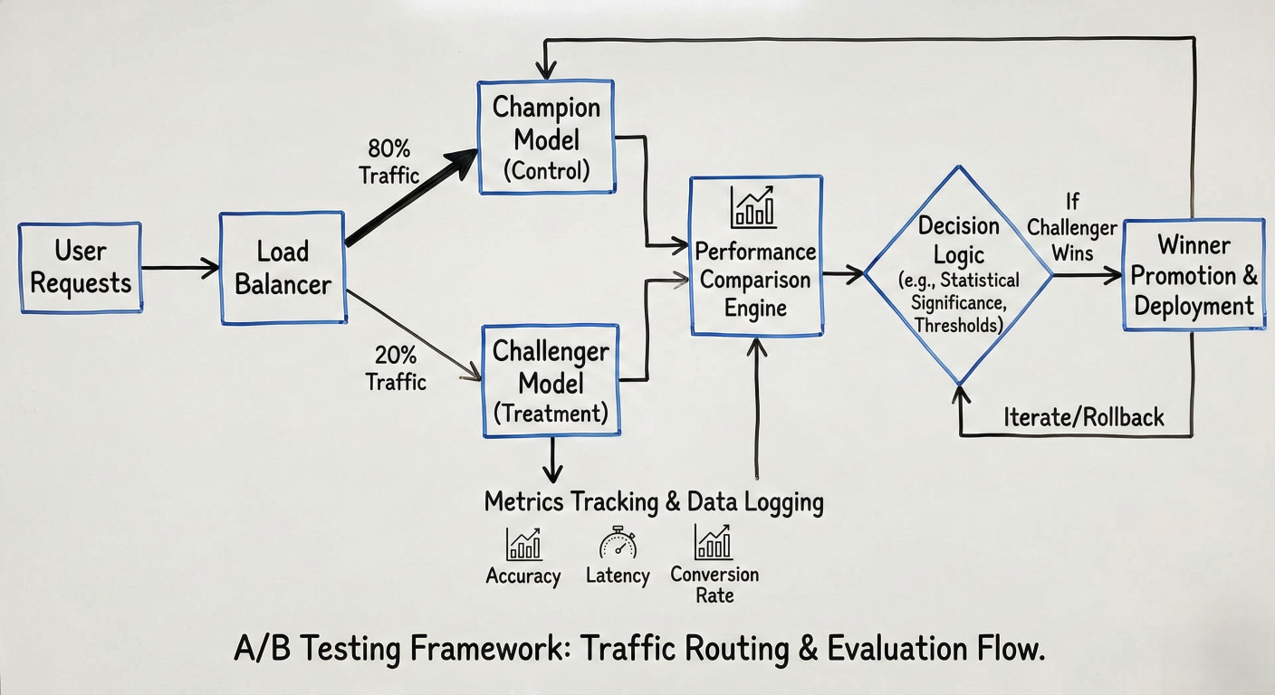 Troubleshooting flowchart showing: Performance alert → Drift detection → Data quality check → Model retraining → Validation → Deployment. Include decision points and rollback procedures.