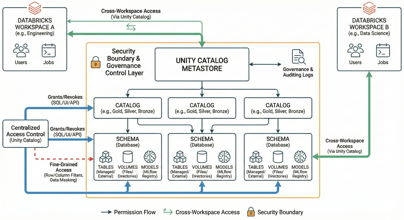Architecture diagram showing Unity Catalog structure: Catalogs → Schemas → Models, Tables, Volumes. Show permission flows and cross-workspace access patterns. Include security boundaries and governance controls.