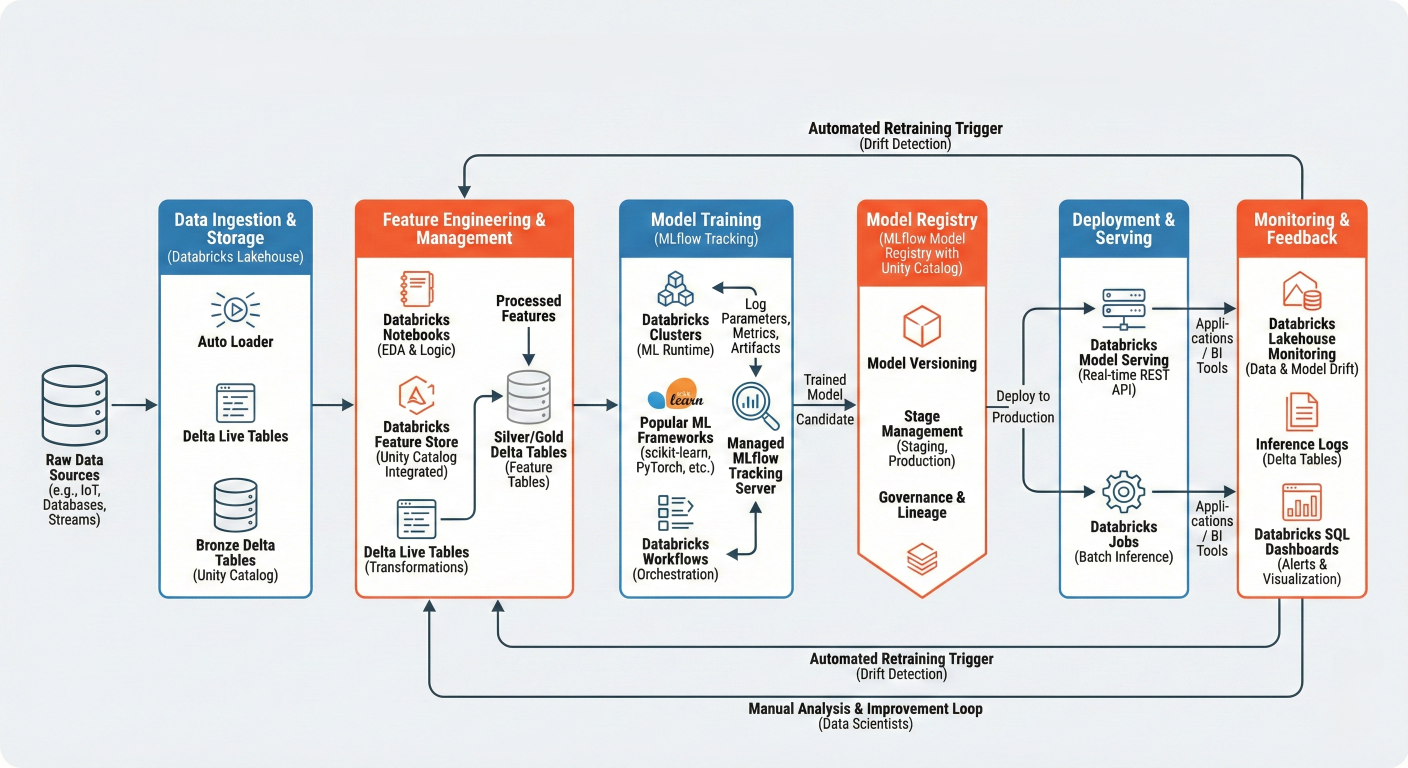 Detailed workflow diagram showing: Raw Data → Feature Engineering → Model Training (MLϐlow tracking) → Model Registry → Deployment → Monitoring, with feedback loops. Include speciϐic Databricks components at each stage.
