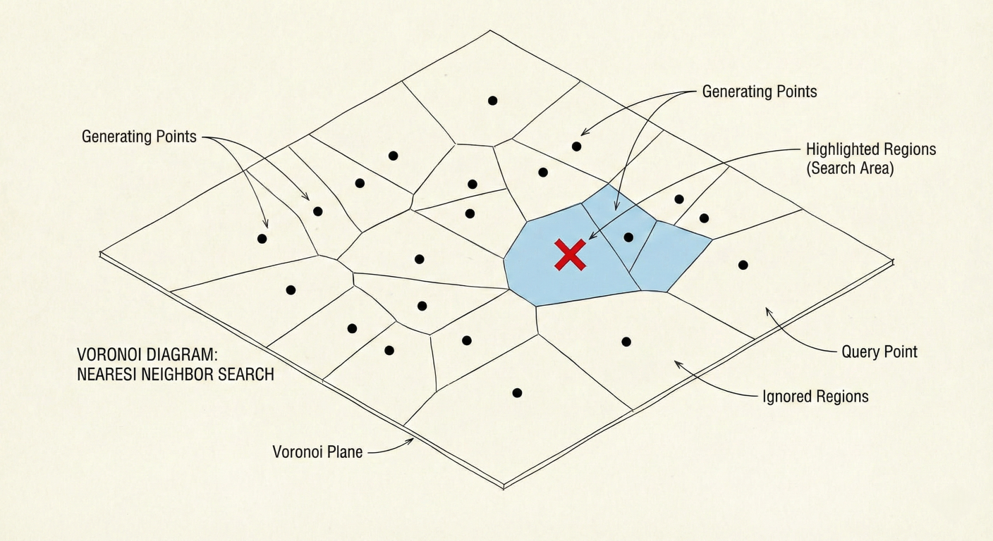 Detailed description about picture/Architecture/Diagram: A 2D visualization of Voronoi cells. Points are scattered on a plane. The plane is divided into polygonal regions. A red 'X' (query) lands in one region. The search algorithm highlights that region and perhaps one neighbor, showing that the rest of the points are ignored.