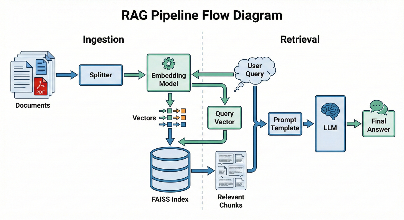 Detailed description about picture/Architecture/Diagram: A flow diagram showing the RAG pipeline. On the left (Ingestion), documents flow into a Splitter, then an Embedding Model, resulting in Vectors that go into the FAISS Index. On the right (Retrieval), a User Query flows into the same Embedding Model, producing a Query Vector. This Query Vector hits the FAISS Index, which outputs "Relevant Chunks". These chunks join the User Query in a Prompt Template, which feeds into the LLM, producing the Final Answer.