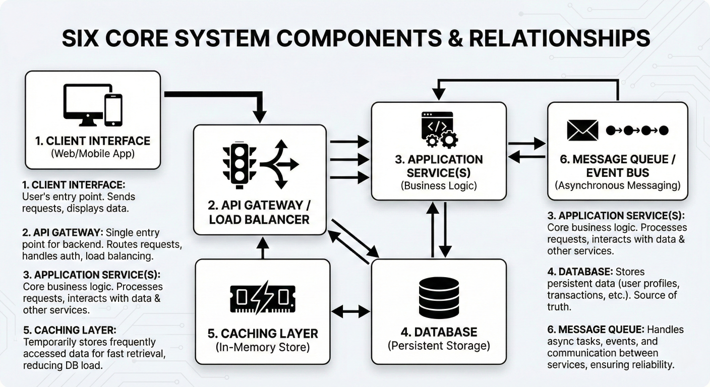 Six core components block diagram with detailed descriptions and relationships