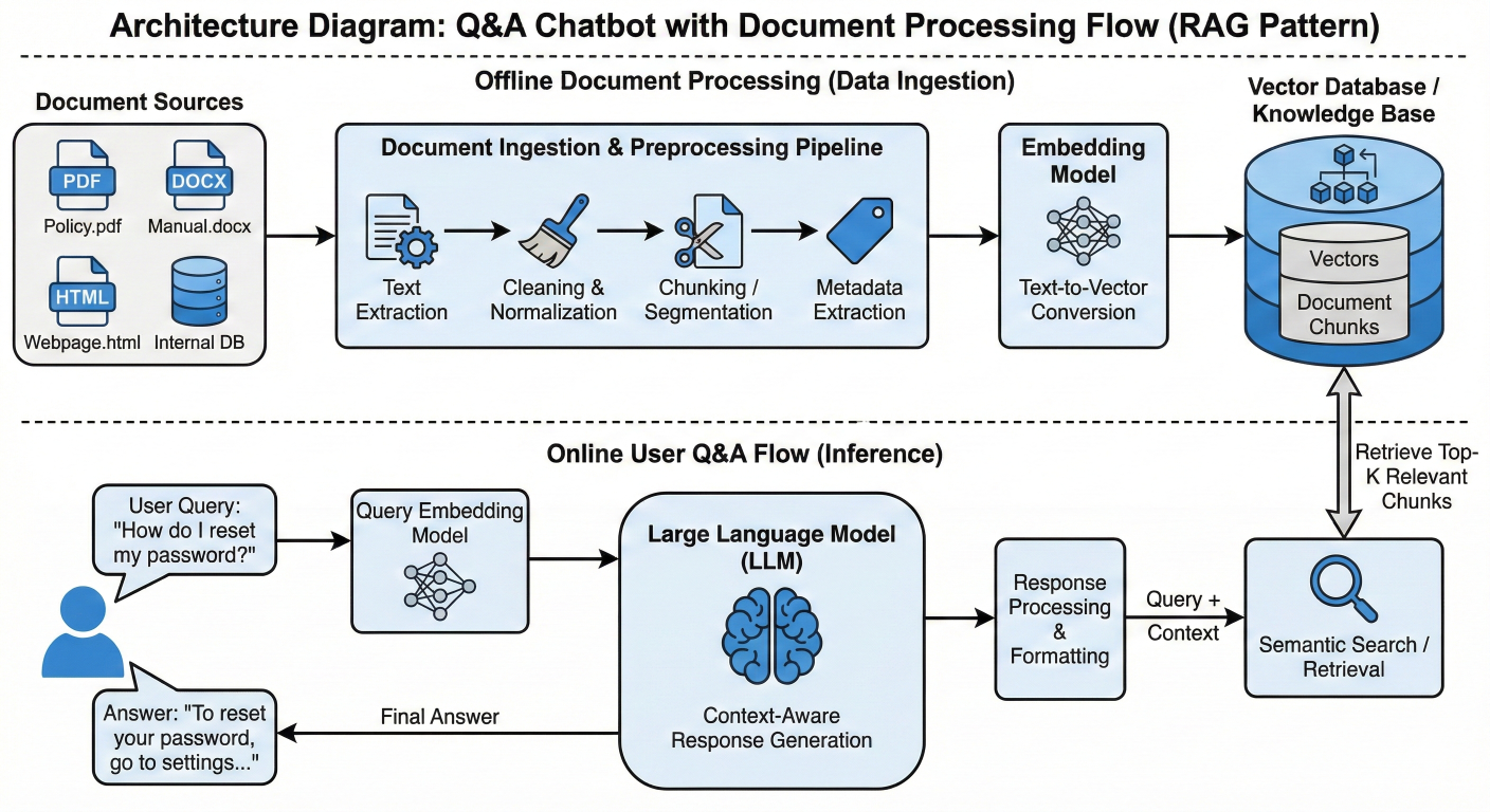3. Retrieval: Handles document loading, text splitting, embedding generation, and vector store operations for external knowledge integration.