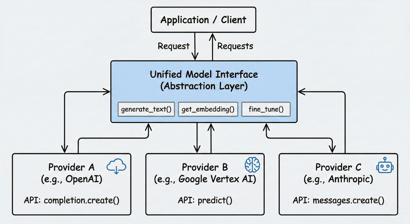 Model interface abstraction diagram showing unified API across providers