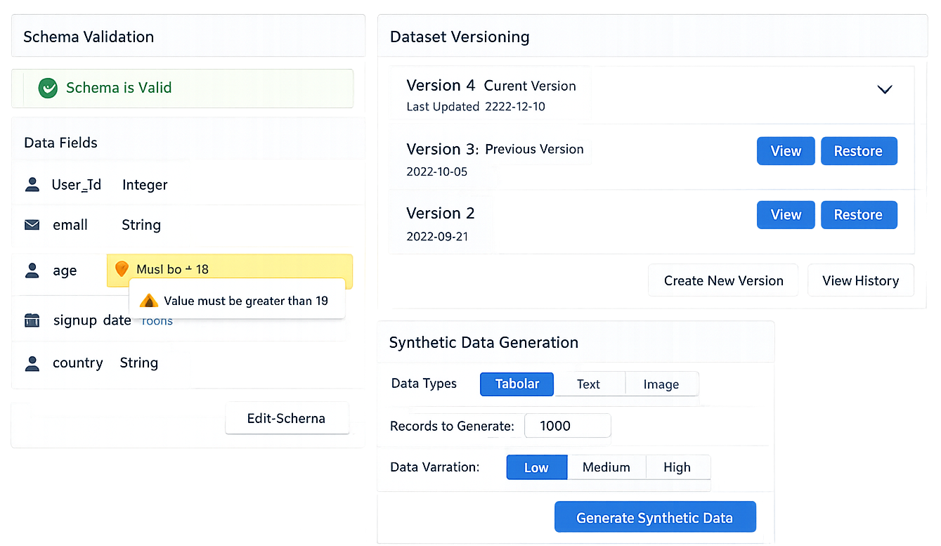 "solution": "Implement dataset review processes, use schema validation, and regularly audit dataset quality",