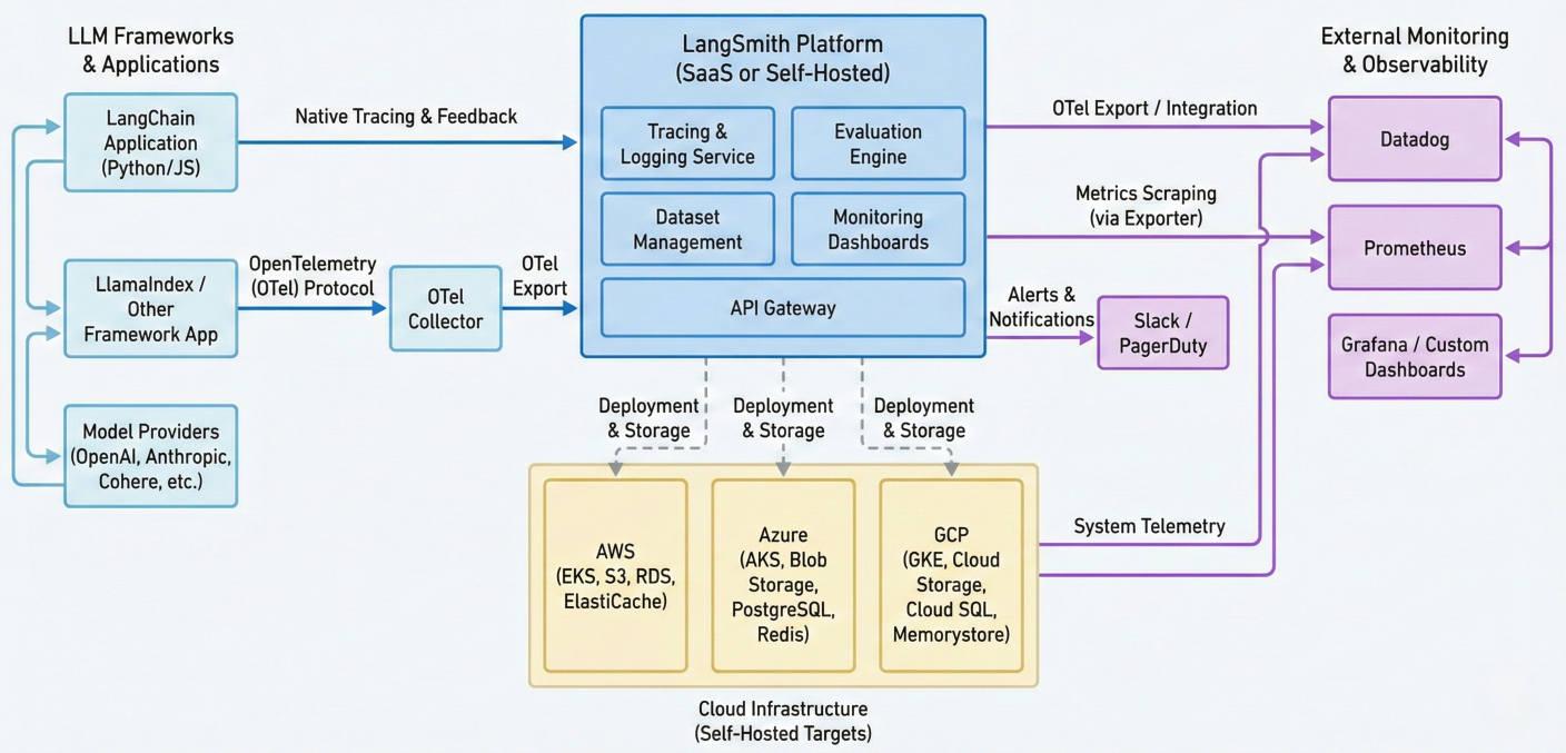 Architecture diagram showing LangSmith integration with different LLM frameworks, cloud providers, and monitoring systems