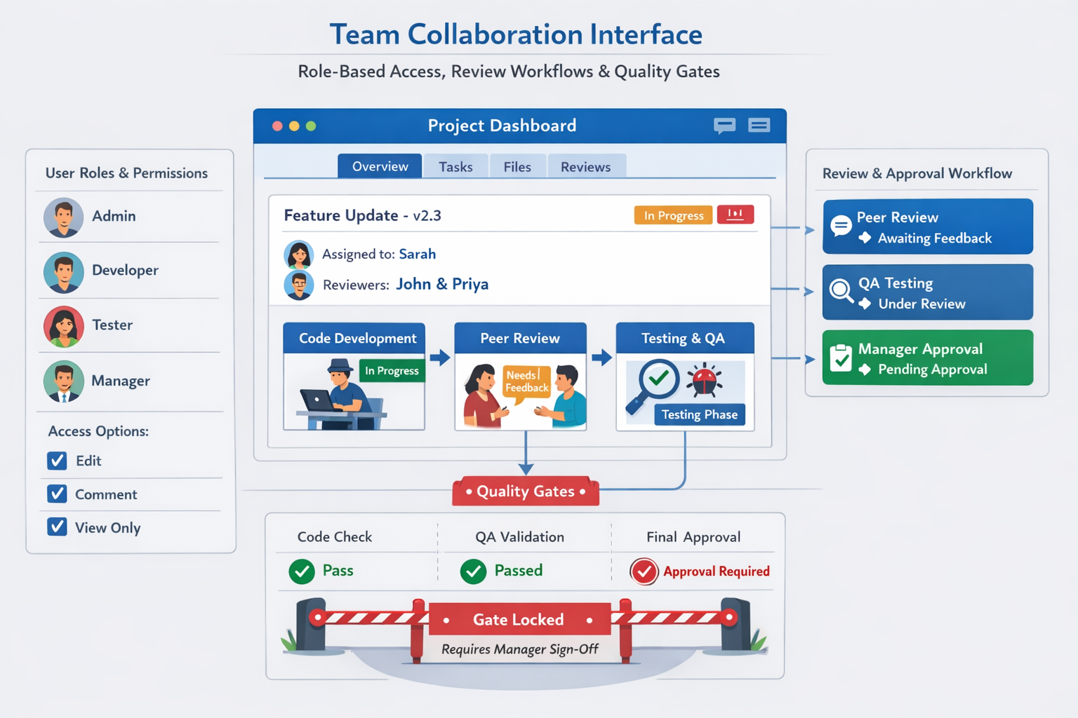 Team collaboration interface showing role-based access, review workflows, and quality gates
