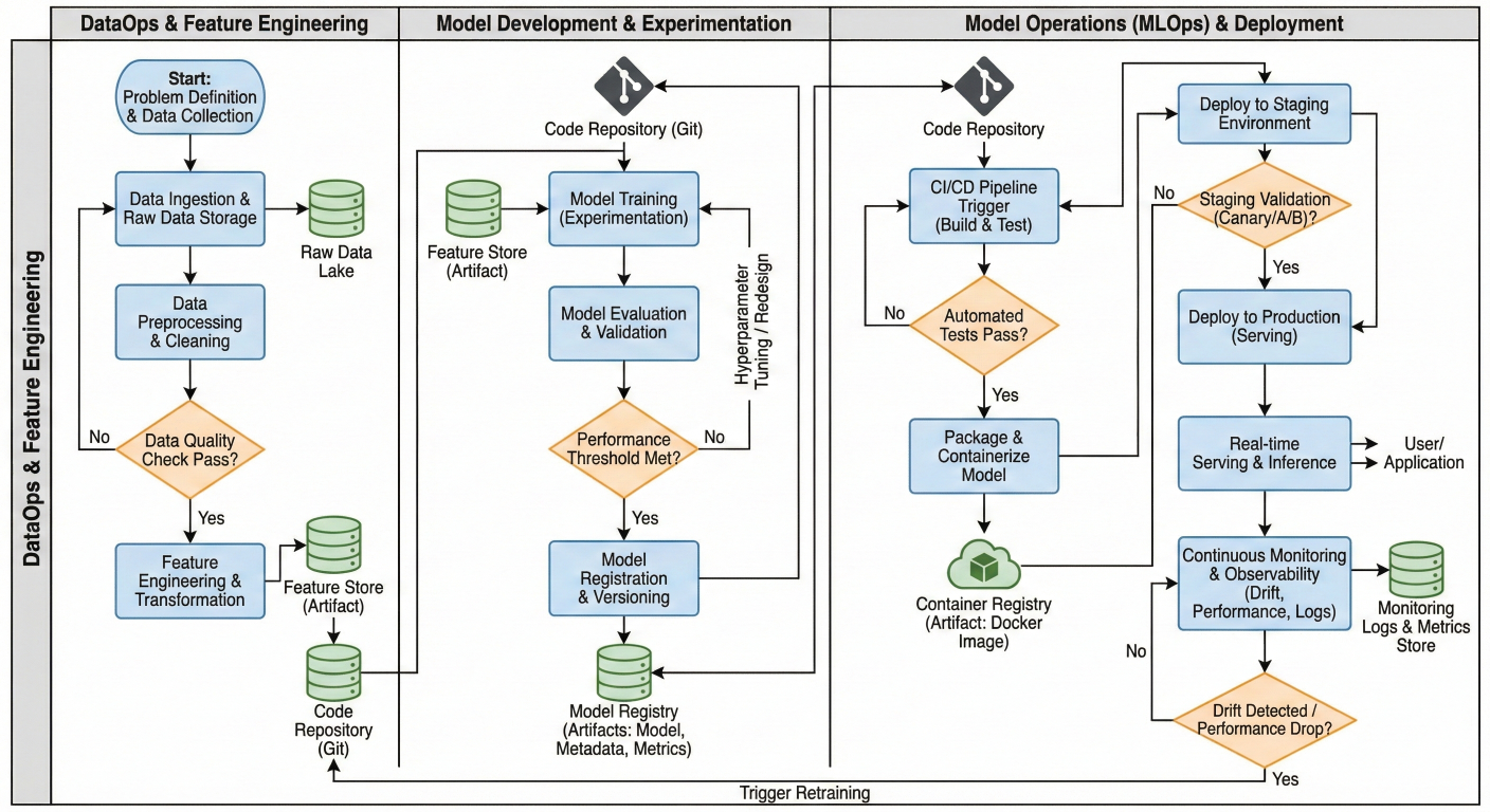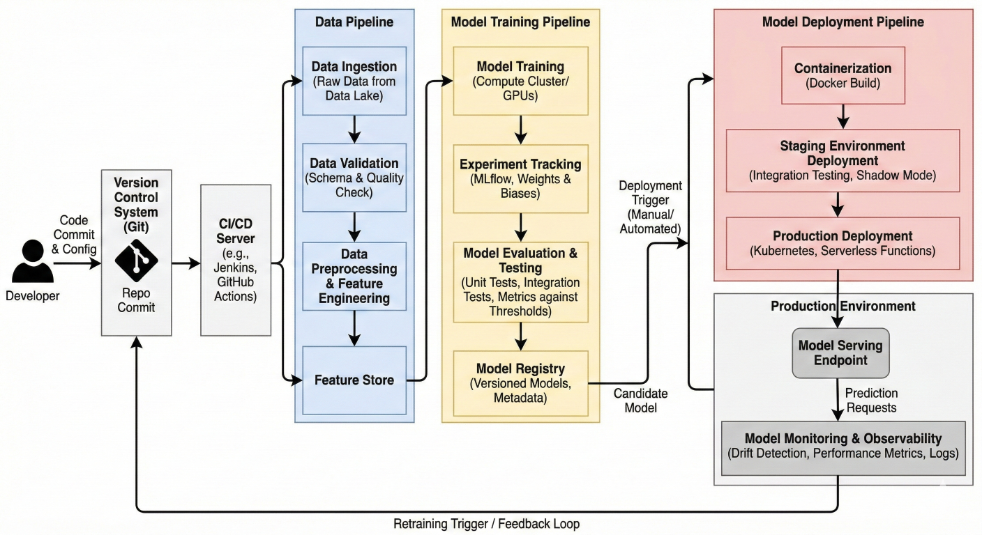 Complete MLOps pipeline flow diagram showing all stages from code commit to production deployment with monitoring feedback loops