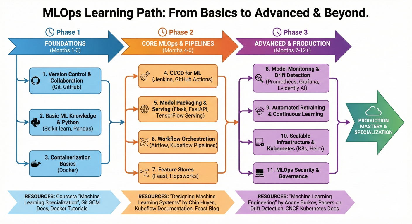 Learning path diagram showing progression from basic MLOps concepts to advanced topics with recommended resources and timeline