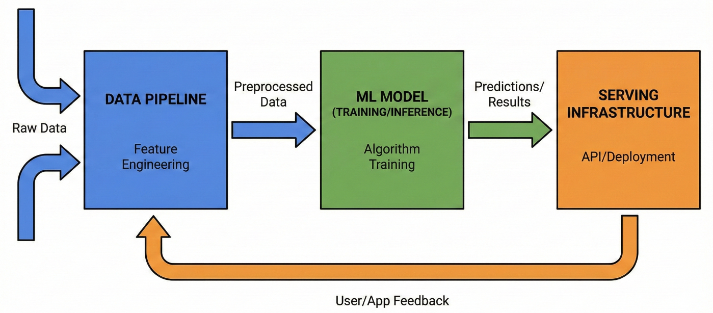 Diagram showing the three components of ML applications with their interconnections and data flow