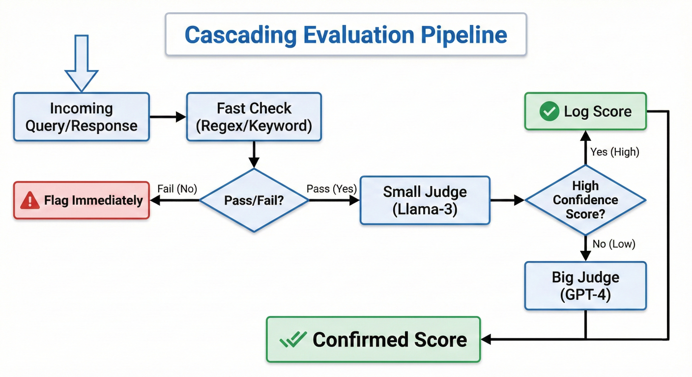 A flowchart showing a "Cascading Evaluation Pipeline". Step 1: Incoming Query/Response -> "Fast Check" (Regex/Keyword). Decision Diamond: Pass/Fail? If Fail -> Flag immediately. If Pass -> Step 2: "Small Judge" (Llama-3). Decision Diamond: High Confidence Score? If Yes -> Log Score. If No (Low Confidence) -> Step 3: "Big Judge" (GPT-4). Final Output: Confirmed Score.