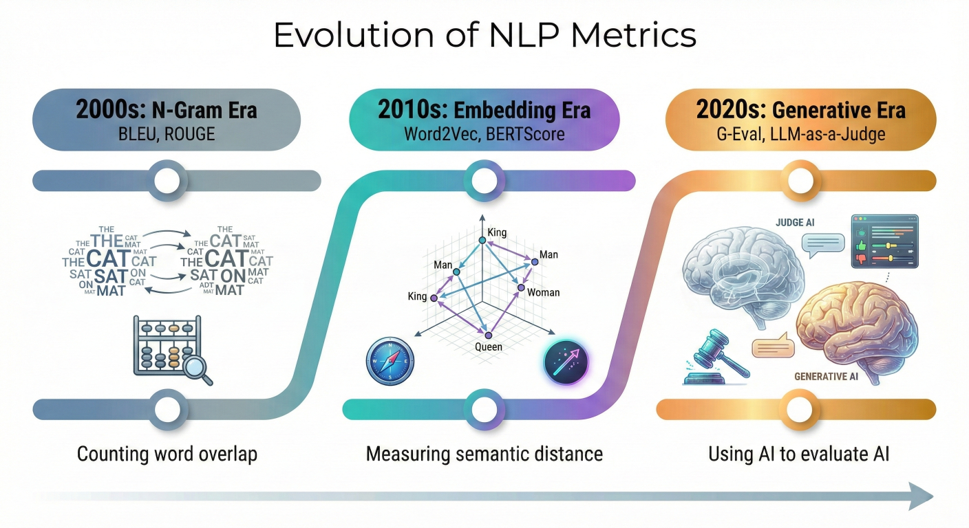 To understand where we are going, we need to understand where we came from. The history of Natural Language Processing (NLP) evaluation is a story of trying to translate human intuition into mathematical formulas. We have moved through three distinct eras: the N-Gram Era, the Embedding Era, and now, the Generative Era.