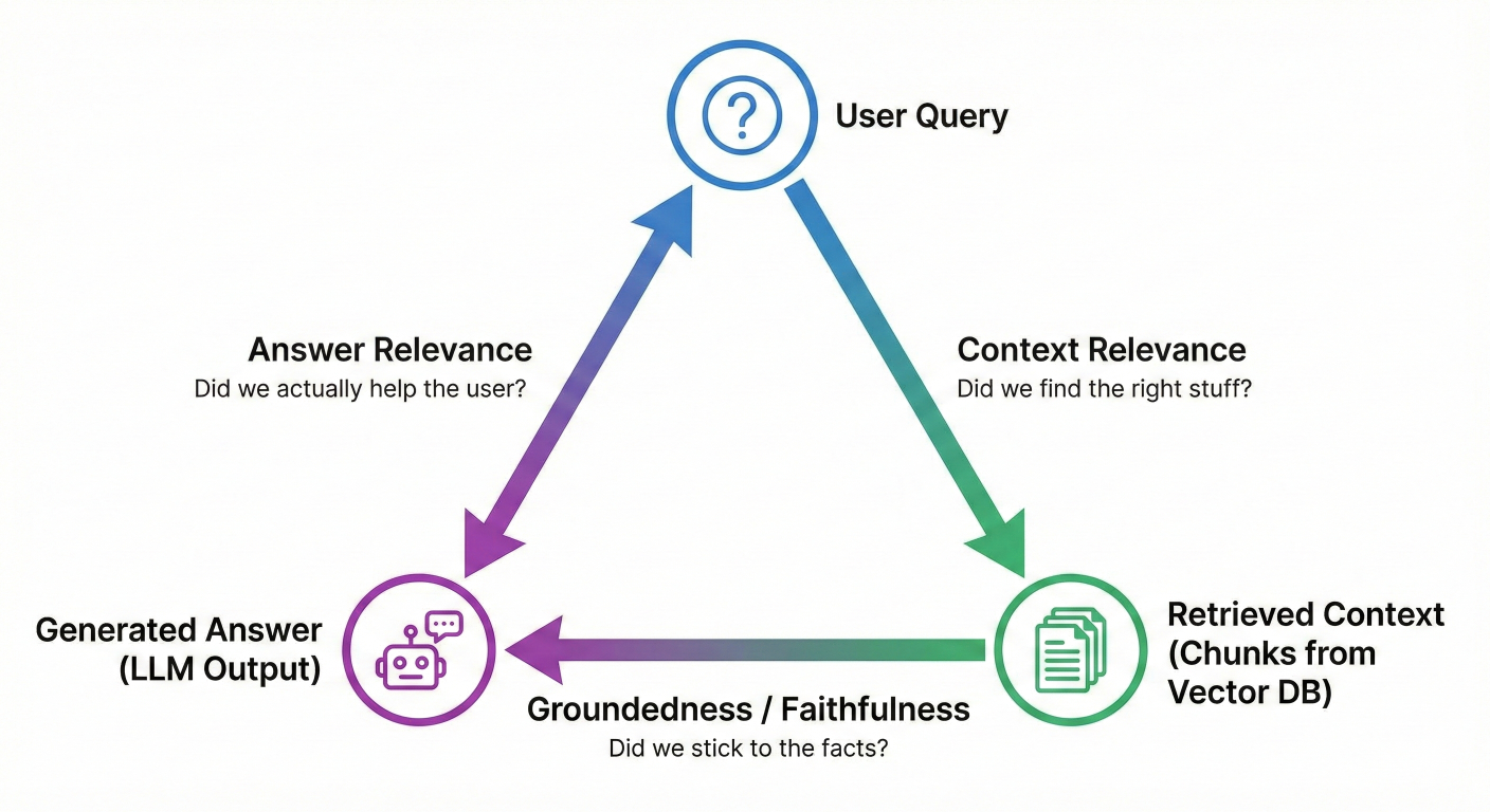 Description: A triangle diagram visualizing the RAG Triad. Top Vertex: "User Query". Bottom Right Vertex: "Retrieved Context" (The chunks from your vector DB). Bottom Left Vertex: "Generated Answer" (The LLM output). Edge 1 (Query -> Context): "Context Relevance" (Did we find the right stuff?). Edge 2 (Context -> Answer): "Groundedness / Faithfulness" (Did we stick to the facts?). Edge 3 (Query -> Answer): "Answer Relevance" (Did we actually help the user?).