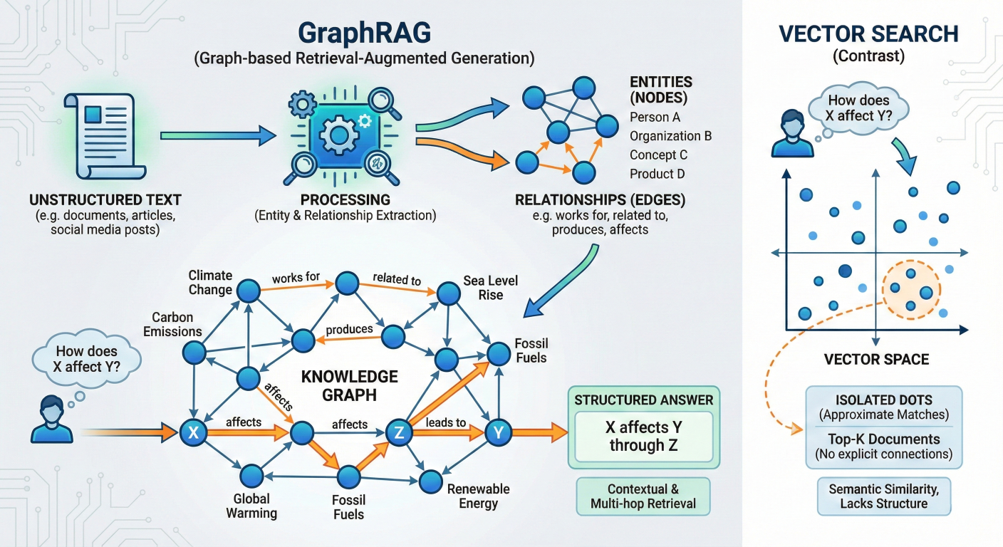 <--- Detailed description about picture/Architecture/Diagram: Diagram of GraphRAG. It shows unstructured text being processed into "Entities" (Nodes) and "Relationships" (Edges) to form a Knowledge Graph. A user query "How does X affect Y?" is shown traversing the edges of the graph to find the answer, contrasting with a Vector Search which just finds isolated dots in a 2D space. --->