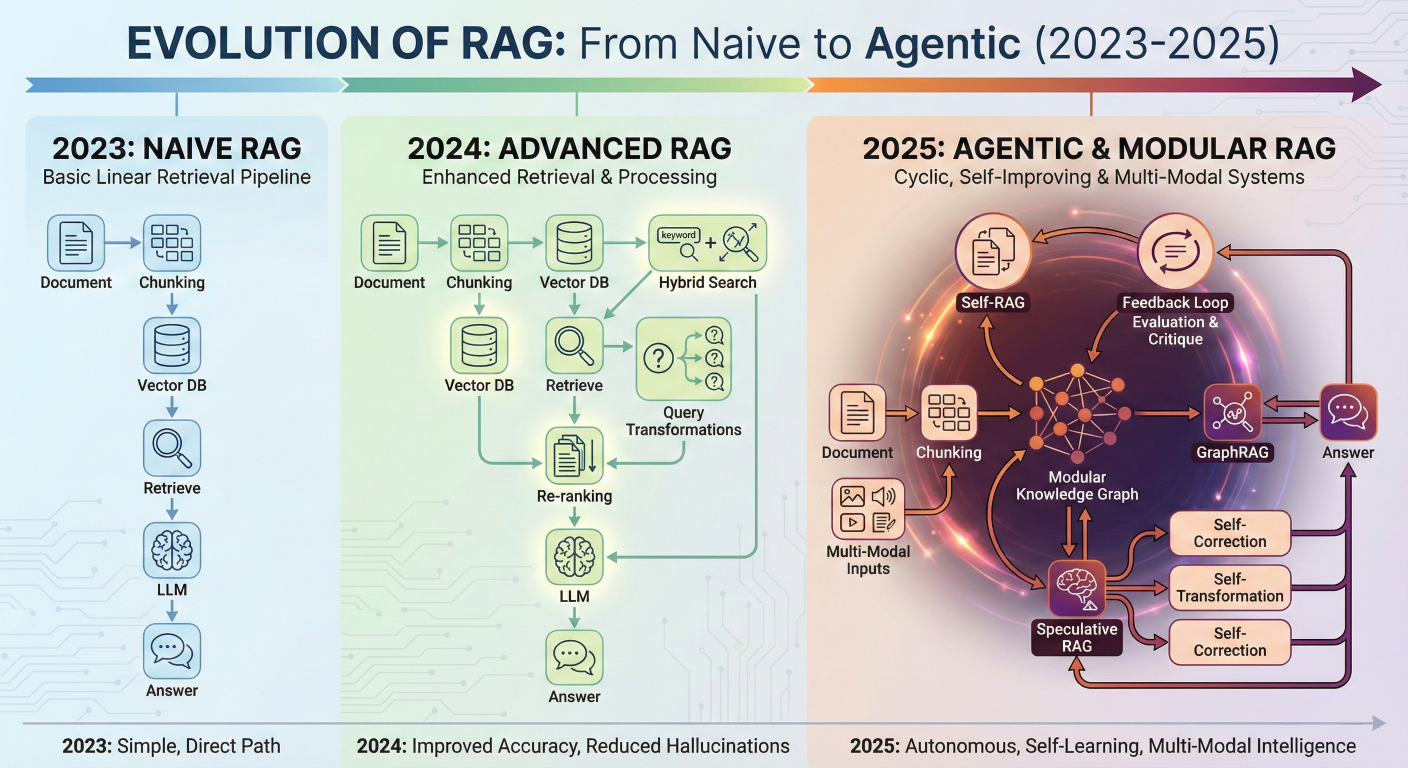 Detailed description about picture/Architecture/Diagram: A comprehensive timeline and evolutionary diagram of RAG. The left side shows "2023: Naive RAG" with a simple linear path (Document -> Chunk -> Vector DB -> Retrieve -> LLM). The center shows "2024: Advanced RAG" introducing Re-ranking, Query Transformations, and Hybrid Search. The right side shows "2025: Agentic & Modular RAG" featuring a cyclic graph with Feedback Loops, Self-Correction, Knowledge Graphs, and Multi-Modal inputs, labeled with terms like "Self-RAG," "GraphRAG," and "Speculative RAG."