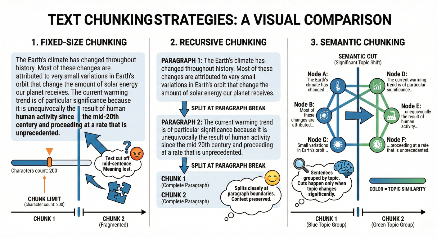 Chunking is the process of breaking large documents into smaller pieces that fit into the LLM's context window. It seems trivial, but it is one of the highest-leverage hyperparameters in RAG.