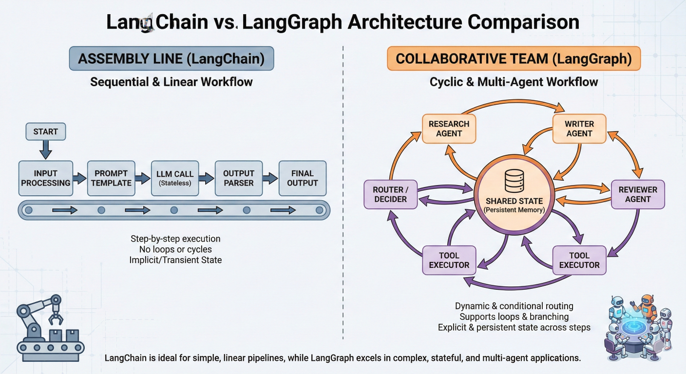 Think of traditional LangChain as a well-organized assembly line: each component performs a specific task and passes the result to the next component in a predetermined sequence. LangGraph, on the other hand, is like a team of specialists who can communicate with each other, revisit previous decisions, and adapt their approach based on intermediate results.