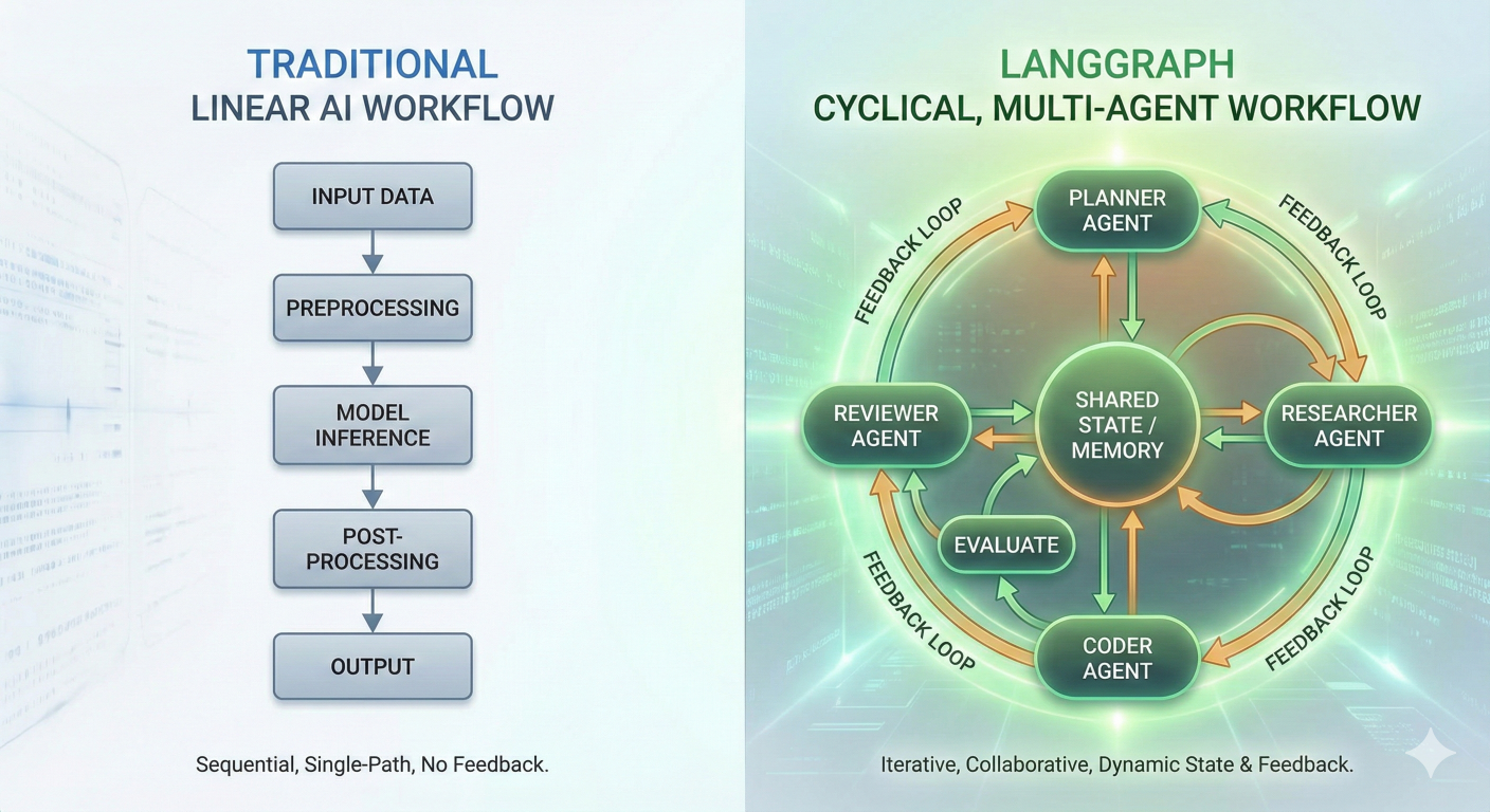 Diagram showing traditional linear AI workflow vs. LangGraph's cyclical, multi-agent workflow with nodes, edges, and feedback loops