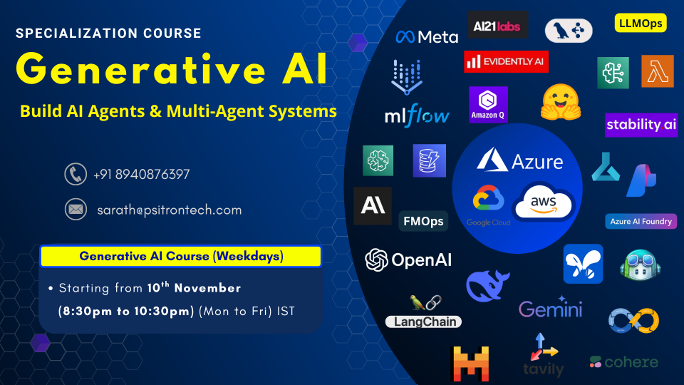 The Generative AI Specialization Course is an industry-focused, hands-on training designed to help professionals master Generative AI, LLMs, and cloud AI solutions. Covering text, image, and multimodal generation, it includes prompt engineering, RAG, fine-tuning, AI agents, and responsible AI practices.